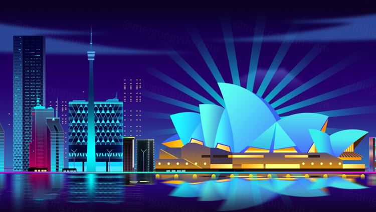 图穷联素材库 » 扁平悉尼歌剧院城市高楼风景房屋平面渐变UI海报背景设计素材