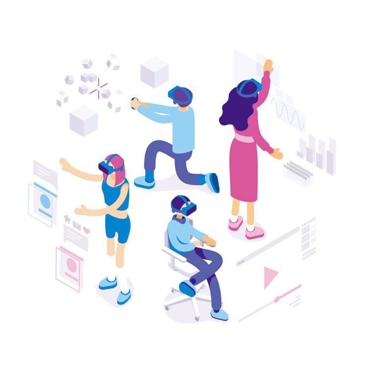 图穷联素材库 » 2.5D等距设计风格VR虚拟增强现实眼镜概念交流娱乐互动矢量EPS插图素材 778017046