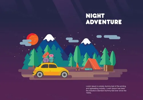图穷联素材库 » 度假自驾旅行夜间拼车矢量插图Night Adventure Carpool Vacation Vector Flat Illu...