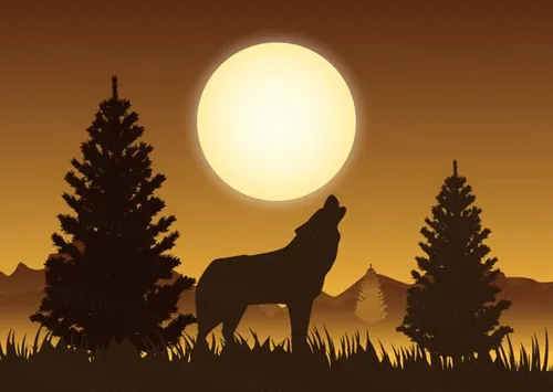 午夜自然景观狼动物剪影矢量图Nature Illustration