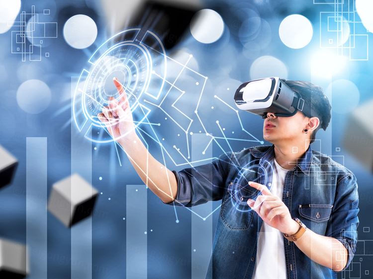 图穷联素材库 » 视觉现实概念年轻人使用VR耳机与对象互动