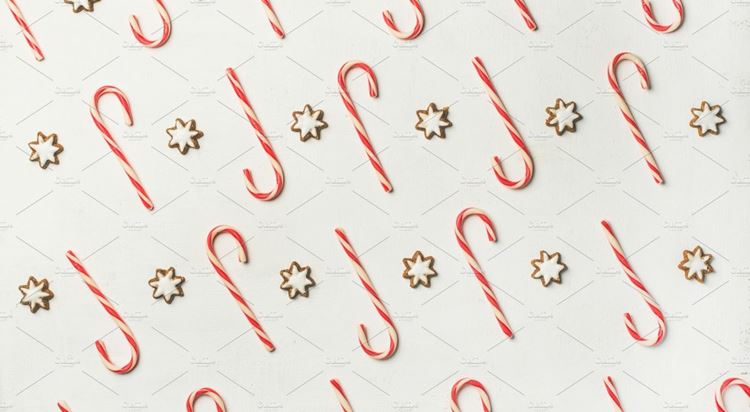 图穷联素材库 » 圣诞节主题背景Christmas holiday food pattern with candy-cane and cookies , top...