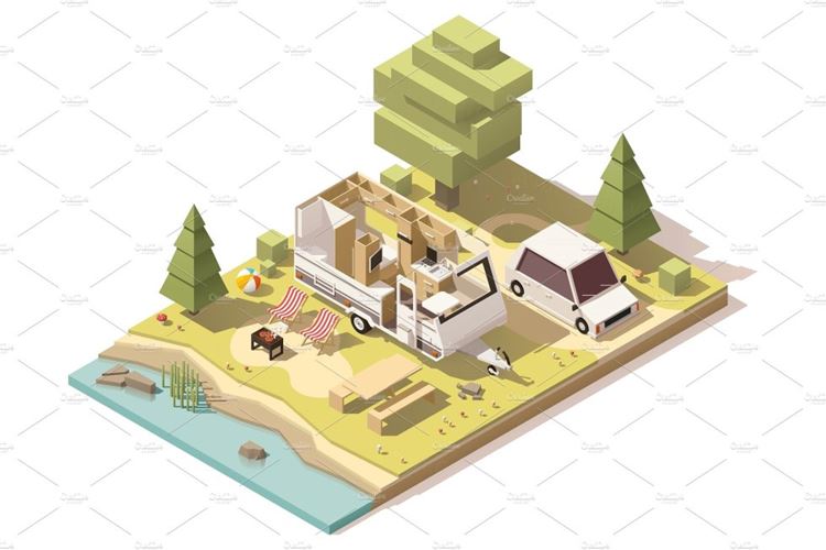 图穷联素材库 » 在旅游度假营地的露营房车矢量等距设计素材 Vector isometric low poly camper