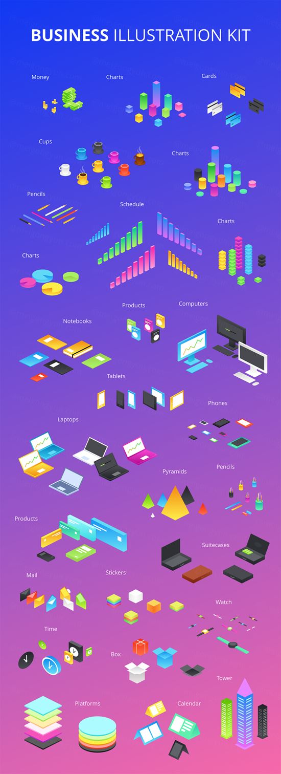 图穷联素材库 » 商业数据图表办公用品电脑插图矢量设计素材Business Illustration kit