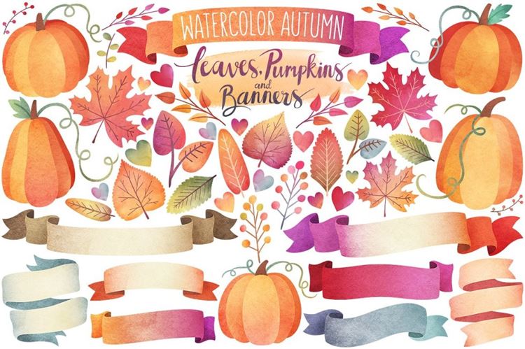 图穷联素材库 » Watercolor Autumn Leaves-amp; Banners