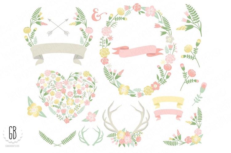 图穷联素材库 » 手绘花卉植物设计素材Flower wreaths pastel heart antlers