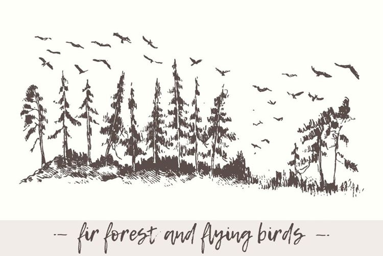 图穷联素材库 » 手绘户外森林矢量插图Landscape with fir forest and birds