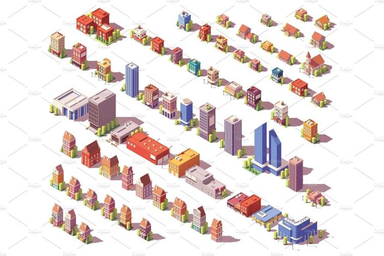 图穷联素材库 » 矢量楼房图标素材Vector low poly isometric buildings set