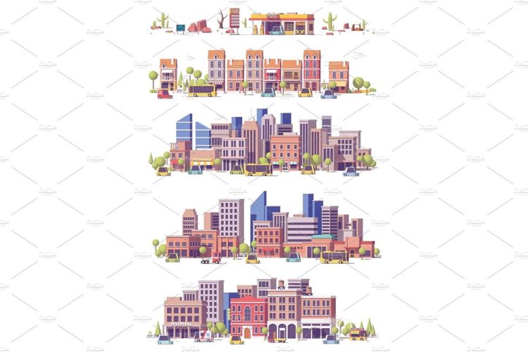 图穷联素材库 » 矢量低聚2D城市场景插图素材Vector low poly 2d city scenes