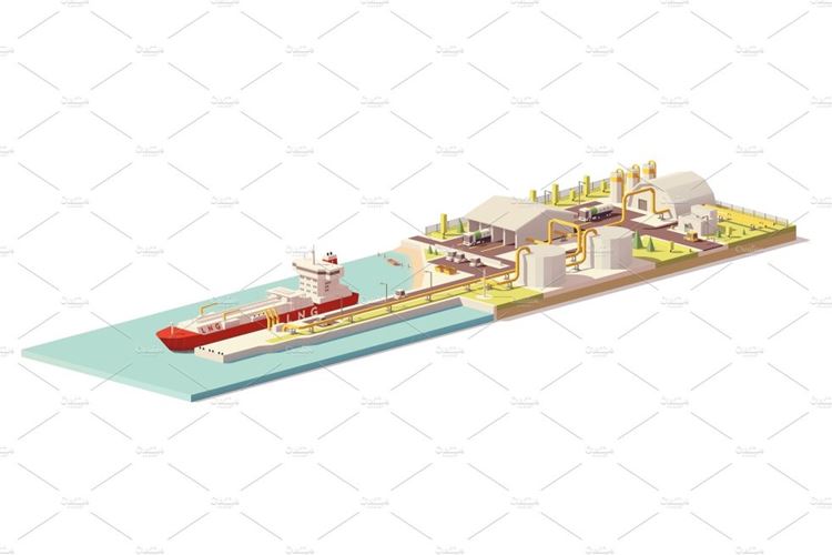 图穷联素材库 » 矢量低聚海港运输插图设计Vector low poly LNG terminal and LNG carrier ship