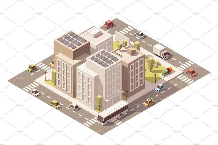 图穷联素材库 » 矢量等距现代建筑摩天大楼插图设计Vector isometric low poly town street with bu...