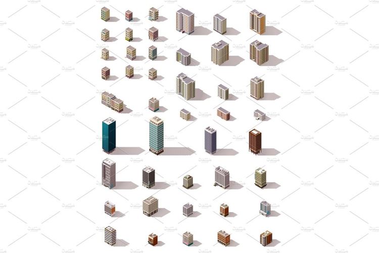 图穷联素材库 » 矢量等距低聚建筑和房屋插图设计Vector isometric buildings set