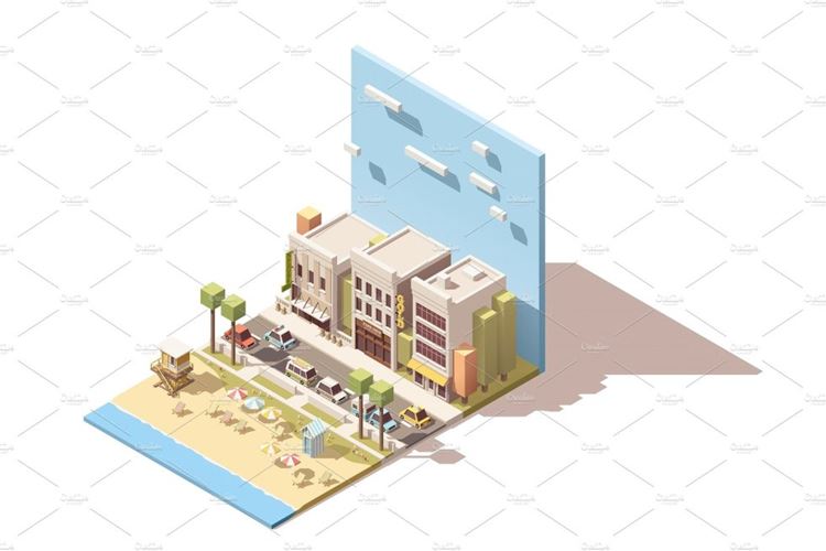 图穷联素材库 » 矢量等距海边的楼房插图设计素材Vector isometric town beach