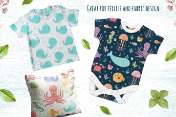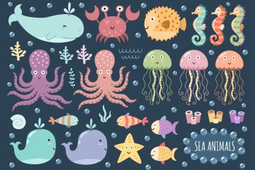 分享一组可爱的海洋动物矢量无缝背景素材[ai],30个元素,包括可爱的鲸鱼,章鱼,螃蟹,鱼类,海马,明星,水晶,海藻,珊瑚,泡沫,波浪和泡沫等,尺寸为5556×5556,400dpi。