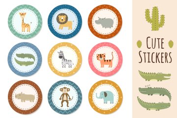 9个可爱的贴纸(AI和EPS10,所有贴纸都在一个文件中,PNG带有透明背景,300dpi);