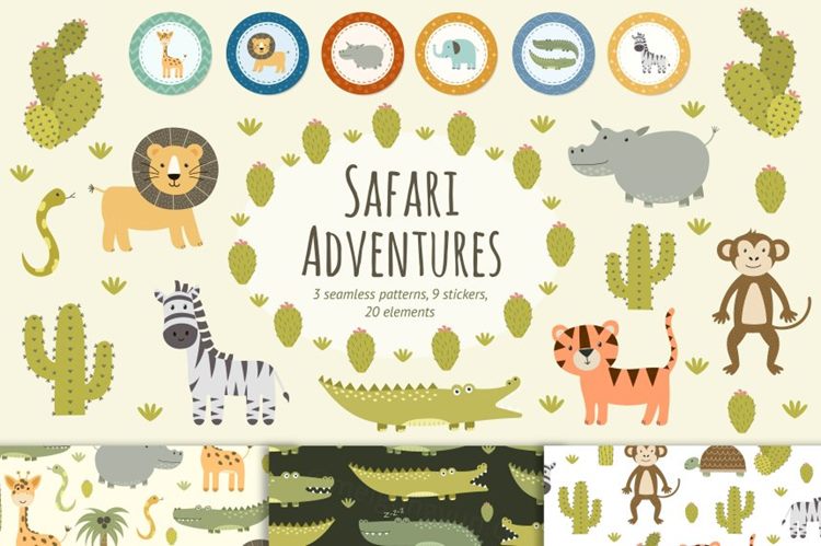 与徒步旅行队动物的逗人喜爱的无缝的样式和贴纸收藏 - 河马,鳄鱼,狮子,大象,长颈鹿,老虎,斑马,猴子,犀牛和乌龟。此套装包括3个无缝图案,9个贴纸和20个元素。幼稚风格的漂亮纹理伟大的织物和纺织,壁纸,背景,卡和横幅设计。