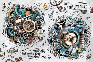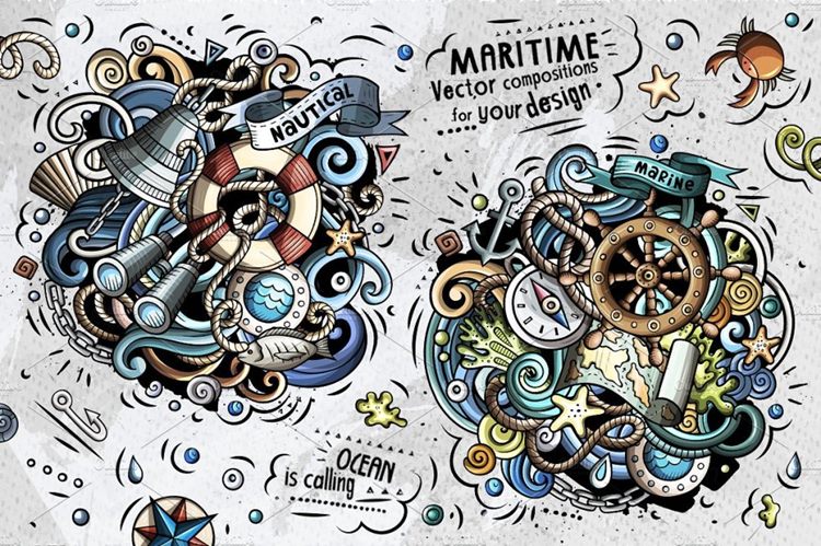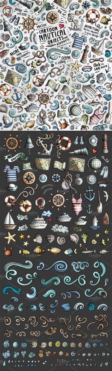 182矢量卡通手绘航海和海上生活卡通对象和装饰元素+矢量文件与组成中的元素(如预览2)