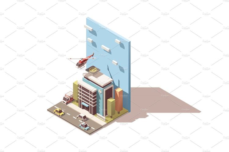 图穷联素材库 » 等距医院大楼诊所大楼插图设计Vector isometric hospital with ambulance van and ...