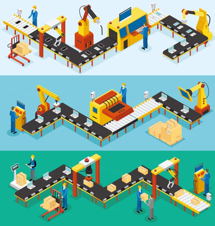 图穷联素材库 » 等距工业厂房水平横幅自动生产线生产装配包装工艺矢量插图设计素材Isometric