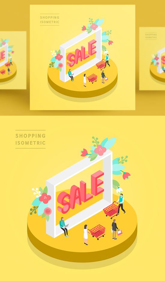 创意时尚彩色购物打折促销商场逛街卡通等距插图矢量设计素材91012
