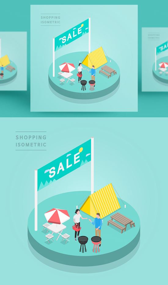 图穷联素材库 » 创意时尚彩色购物打折促销商场逛街2.5D场景卡通等距插图矢量设计素材91101