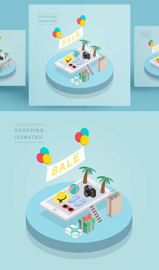 图穷联素材库 » 创意时尚彩色购物打折促销商场逛街2.5D场景卡通等距插图矢量设计素材91102