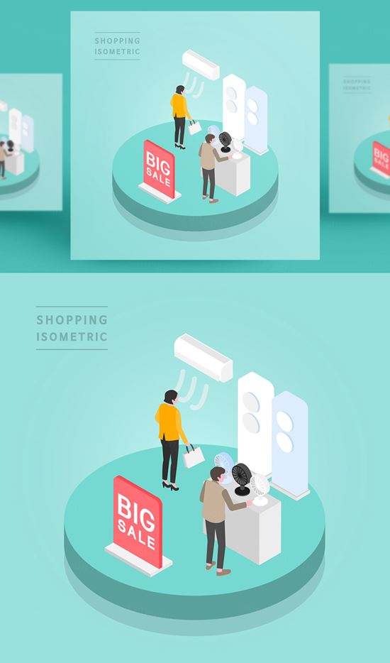 图穷联素材库 » 创意时尚彩色购物打折促销商场逛街2.5D场景卡通等距插图矢量设计素材91106
