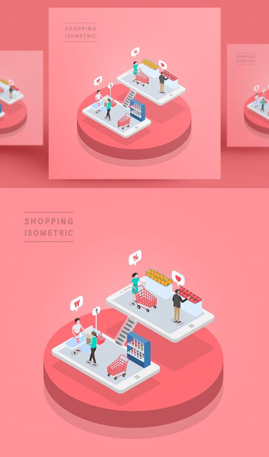 图穷联素材库 » 创意时尚彩色购物打折促销商场逛街2.5D场景卡通等距插图矢量设计素材91114