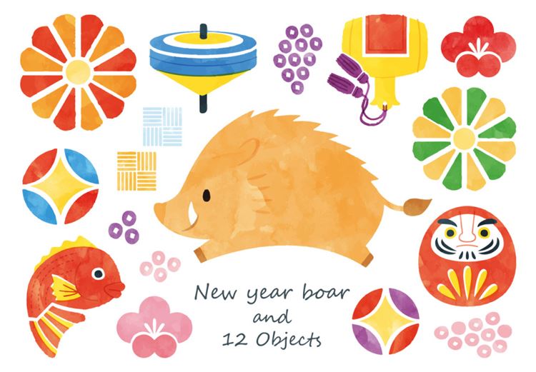 图穷联素材库 » 2019年日式水彩手绘传统新年元素矢量素材合集包