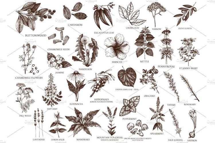 图穷联素材库 » 墨水手绘草本植物素描插图 Vector Plants , Herbs , Seeds Set