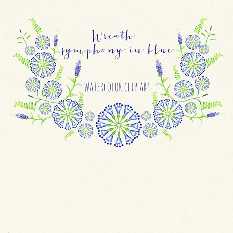 蓝色花卉素材插画 Wreath symphony in blue watercolor