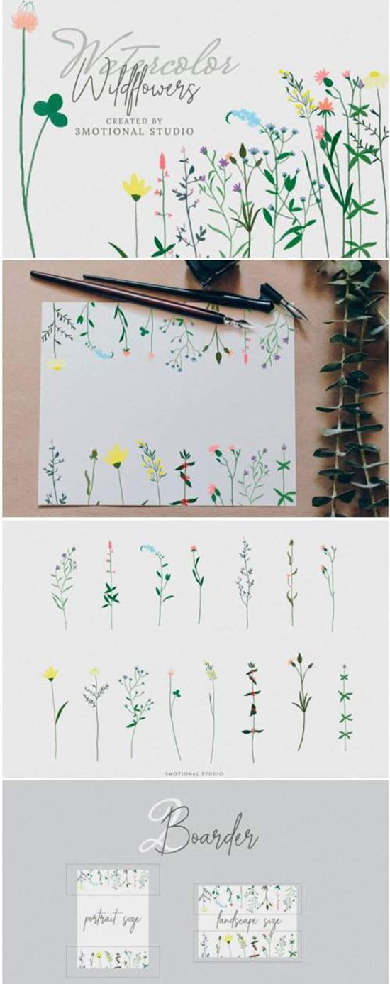 图穷联素材库 » 高分辨率的水彩野花插画合集 Watercolor Wildflowers High Res Png