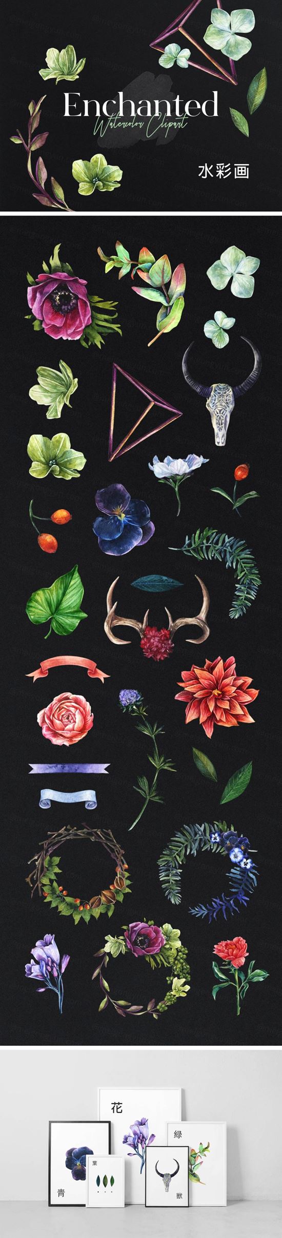 图穷联素材库 » 27种水彩花卉装饰元素PNG精美免扣合集包 Enchanted Watercolor Clipart