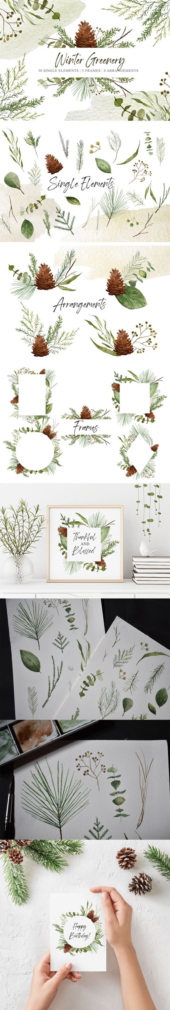 图穷联素材库 » 冬季绿叶水彩剪贴画素材创意合辑 Winter Greenery Clipart Set