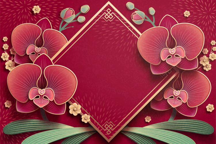 图穷联素材库 » 优雅的兰花和空白春天对联红色背景中国风元素新年传统横幅矢量背景素材