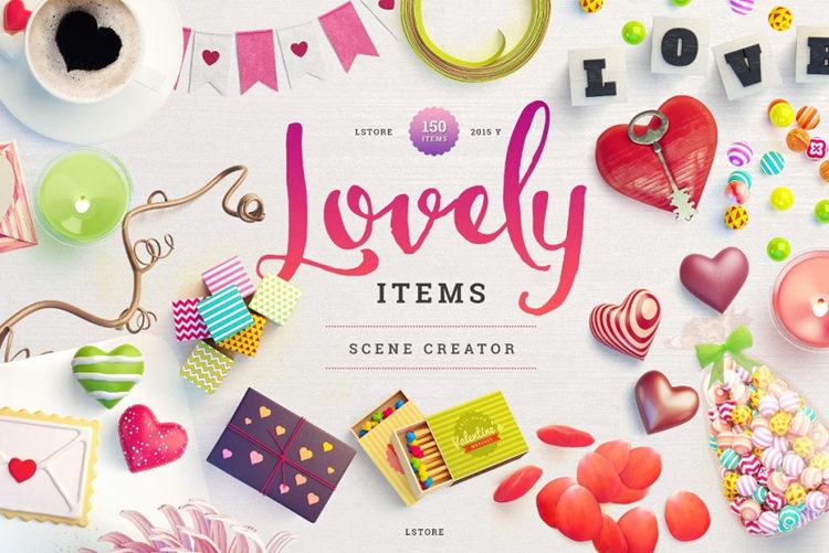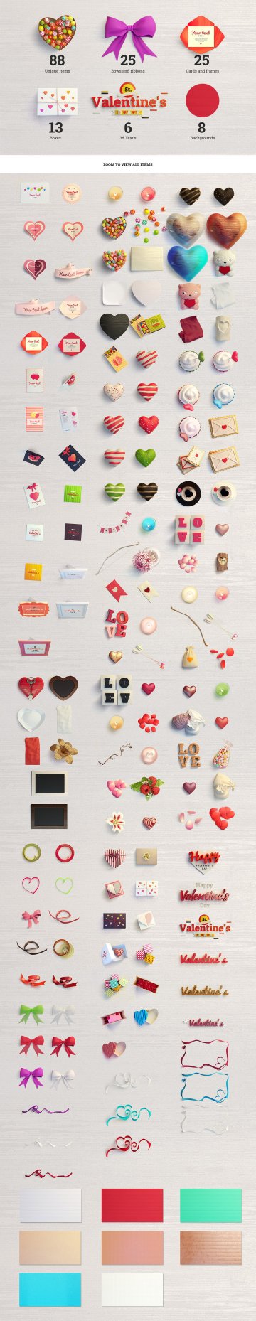 包含不同的明信片、情人节卡片、口袋、情人节心形、鲜花、3d排版、钥匙、糖果、蜡烛、盘子、火柴、蝴蝶结、丝带、饼干和许多其他物品。