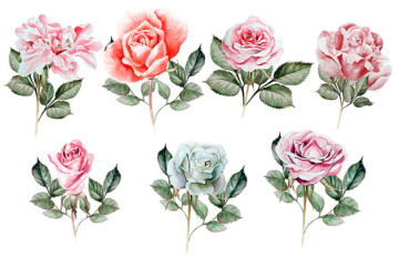 美丽的春天水彩玫瑰为你的设计收藏。玫瑰,花蕾,叶子,花瓣。使用一套卡片、设计、图案、婚礼请柬和其他希望你想象的东西。