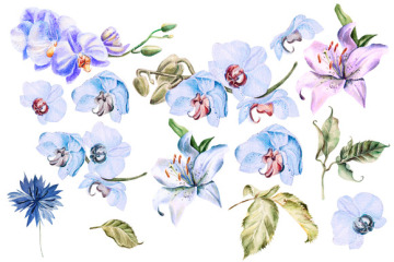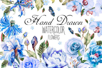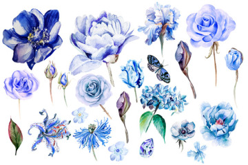 美丽的春天水彩蓝色花朵的奇妙集合,适合你的设计。玫瑰、鸢尾、百合、罂粟、银莲花、牡丹、兰花、矢车菊、花蕾、树叶、蝴蝶。