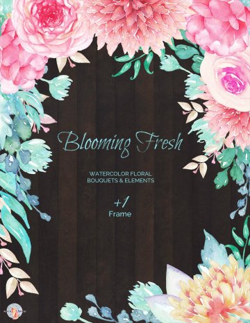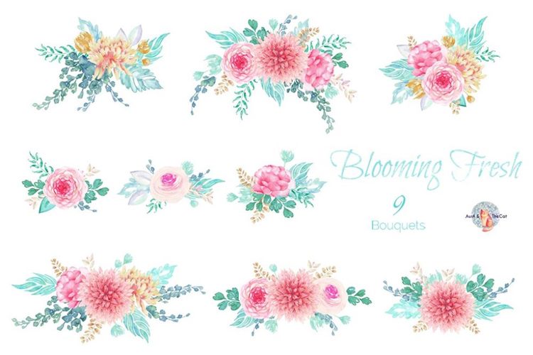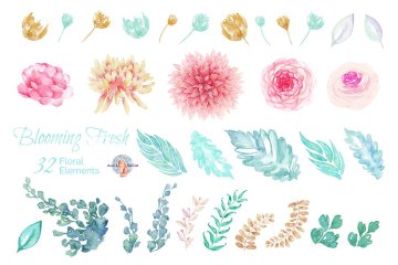 盛开的鲜花水彩剪贴画 Blooming Fresh Wate