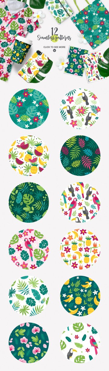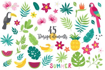 Vector goods with tropical flowers, macaw, toucan, palm leaves, fruit, banana, pineapple, watermelon, monstera, plumeria, orchid. All elements are 100% hand drawn.