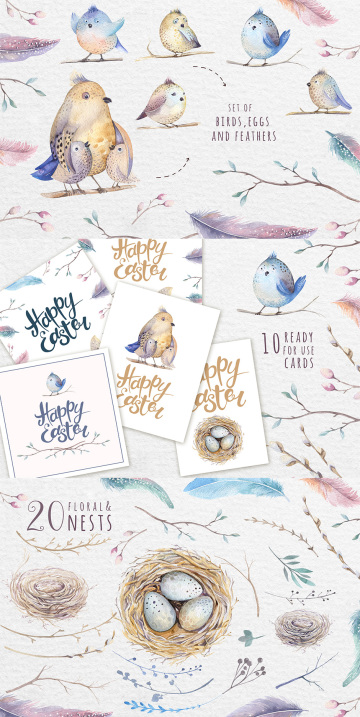 This set of high quality hand painted watercolor birds, nests, feathers and floral elements. Perfect graphics for DIY, wedding invitations, greeting cards, quotes, blogs, posters and more.