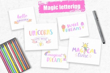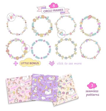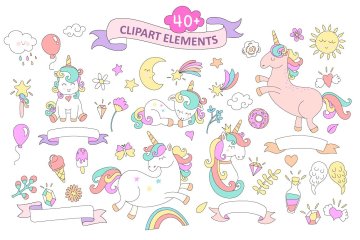 This is a cute set of hand-drawn style cartoon illustrations with sweet unicorns, moon, clouds, stars, flowers and other clipart elements & lettering words .