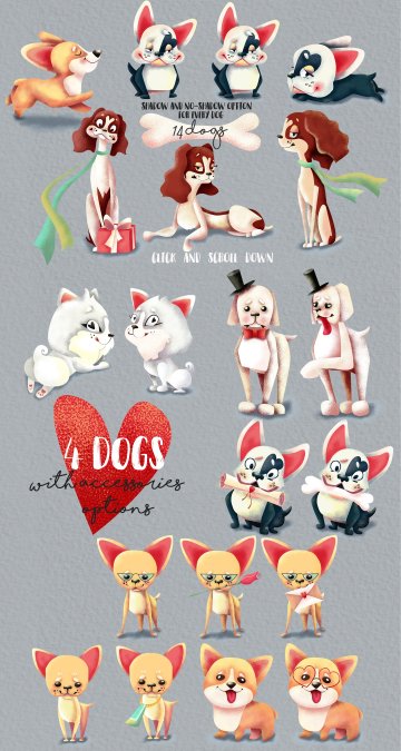 14 dogs. Every dog has shadow and no-shadow options. Also 4 dogs come with accessories options (37 PNG, 14 PSD 2000x4000 px at least);