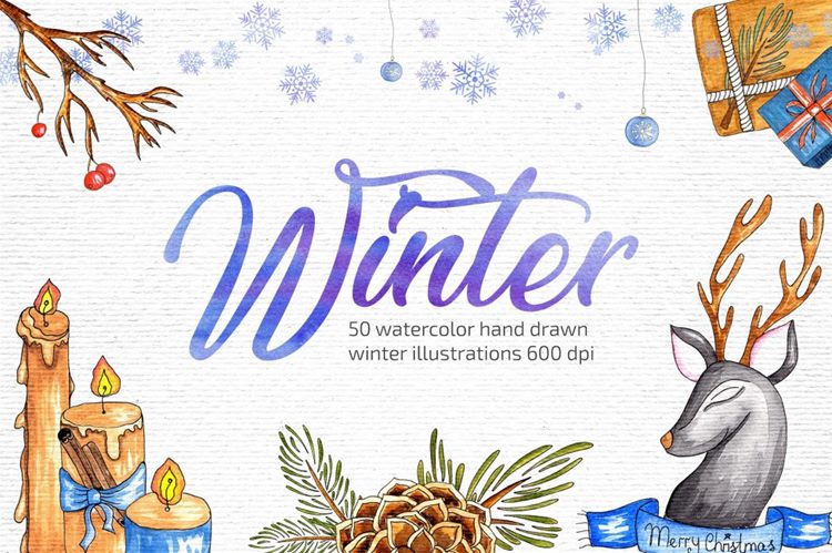冬季水彩手绘PNG免扣元素合集包 Watercolor Wi