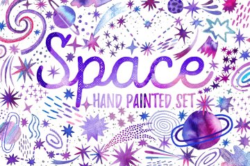 手绘水彩宇宙插画设置在紫罗兰色!空间,外部宇宙,宇宙剪贴画元素。