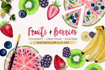 我的新水彩画集关于水果和浆果。让我们享受夏天的色彩吧!你可以在这里创建自己的水果披萨!它非常适合包装纸张,贺卡,包装,纺织品,节日装饰品,剪贴簿设计以及其他许多想法!30个高质量的独立PNG文件。我希望你会喜欢它!