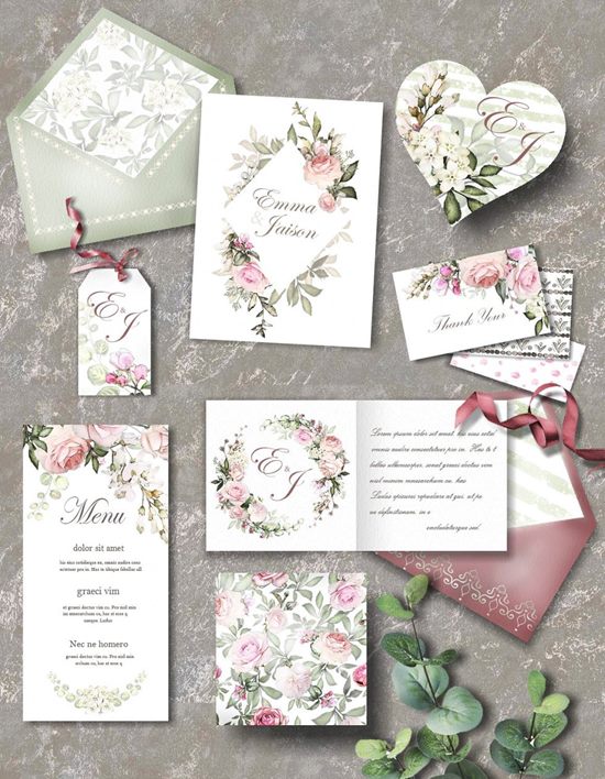 花艺设计集。集合有一个非常浪漫的风格,水彩粉红色和桃子玫瑰,桉树和其他植物。这是理想的用于婚礼请柬,贺卡,报价,品牌等。设计集是在一种风格。大量的安排,作品,框架,无缝模式,花圈,徽章。