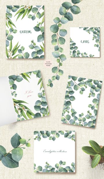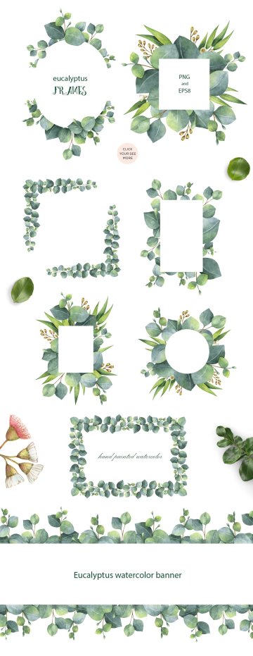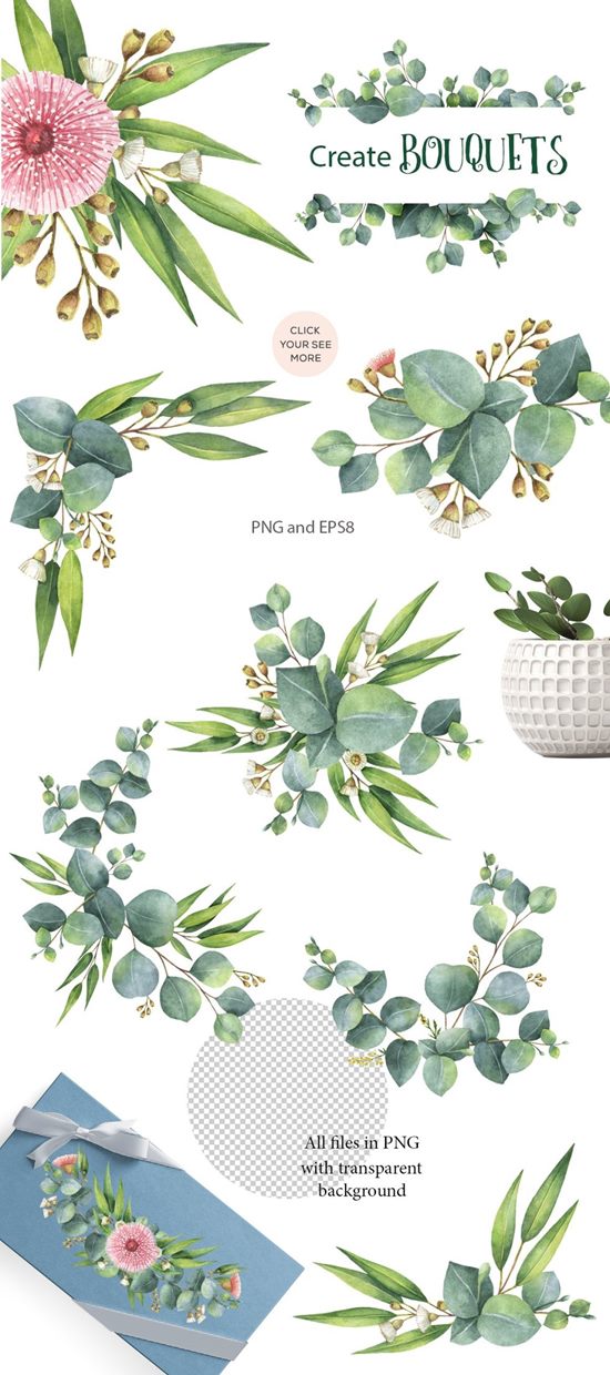 我很高兴向您呈现我的新的水彩收集桉树枝,叶和花。贺卡,数字项目,医药,剪贴簿,卡片装饰,婚礼邀请,纺织品,包装,厨房装饰,厨房艺术印刷品,化妆品,天然和有机产品的完美设计。您将为您的项目创建独特的花束,框架,花圈和图案。你的想象力不受限制。