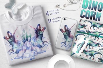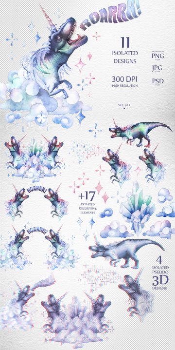 Dinocorns 11个独立设计(透明PNG,JPG和PSD文件)
