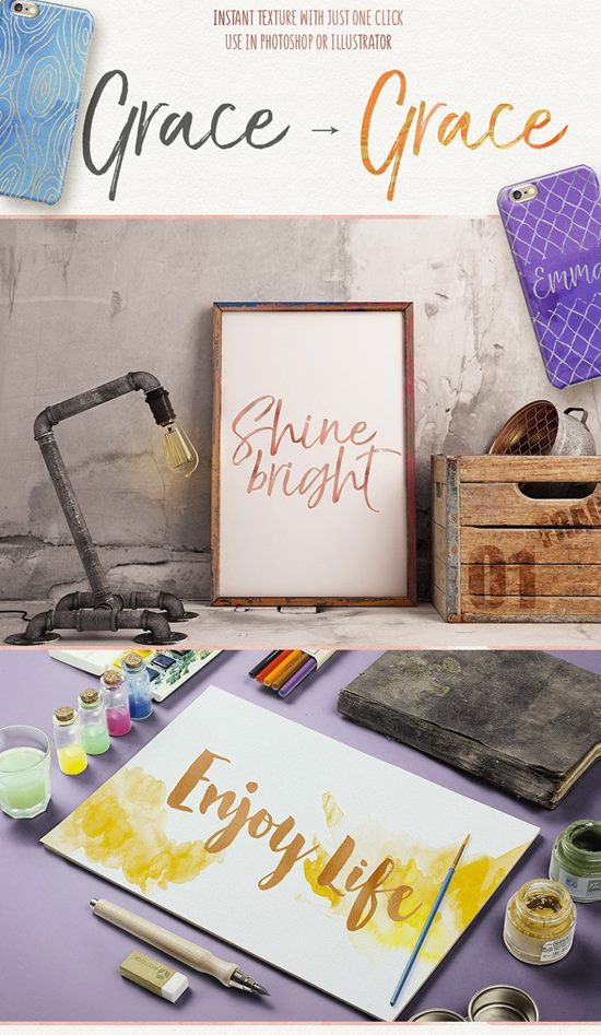 72水彩样式保存为Illustrator样本和Photoshop样式文件。